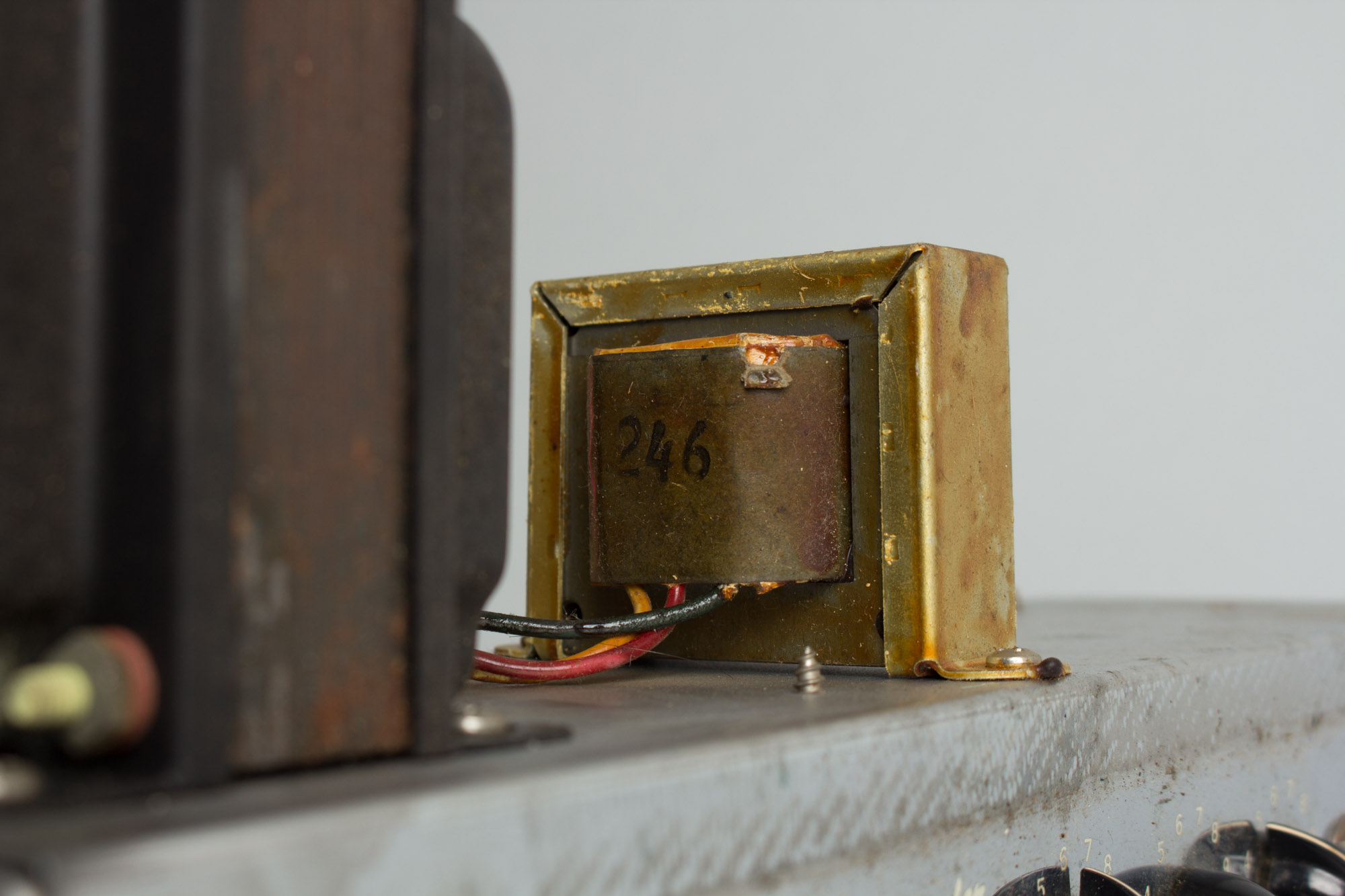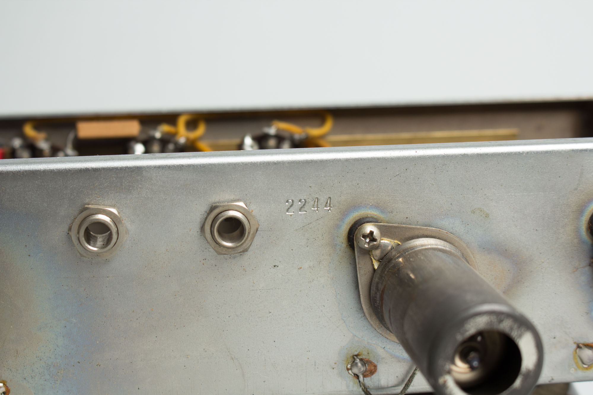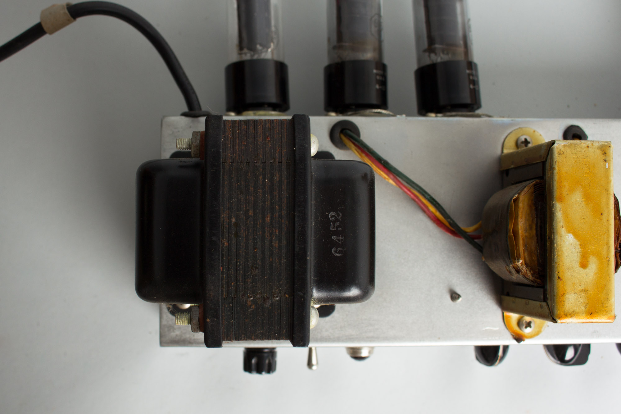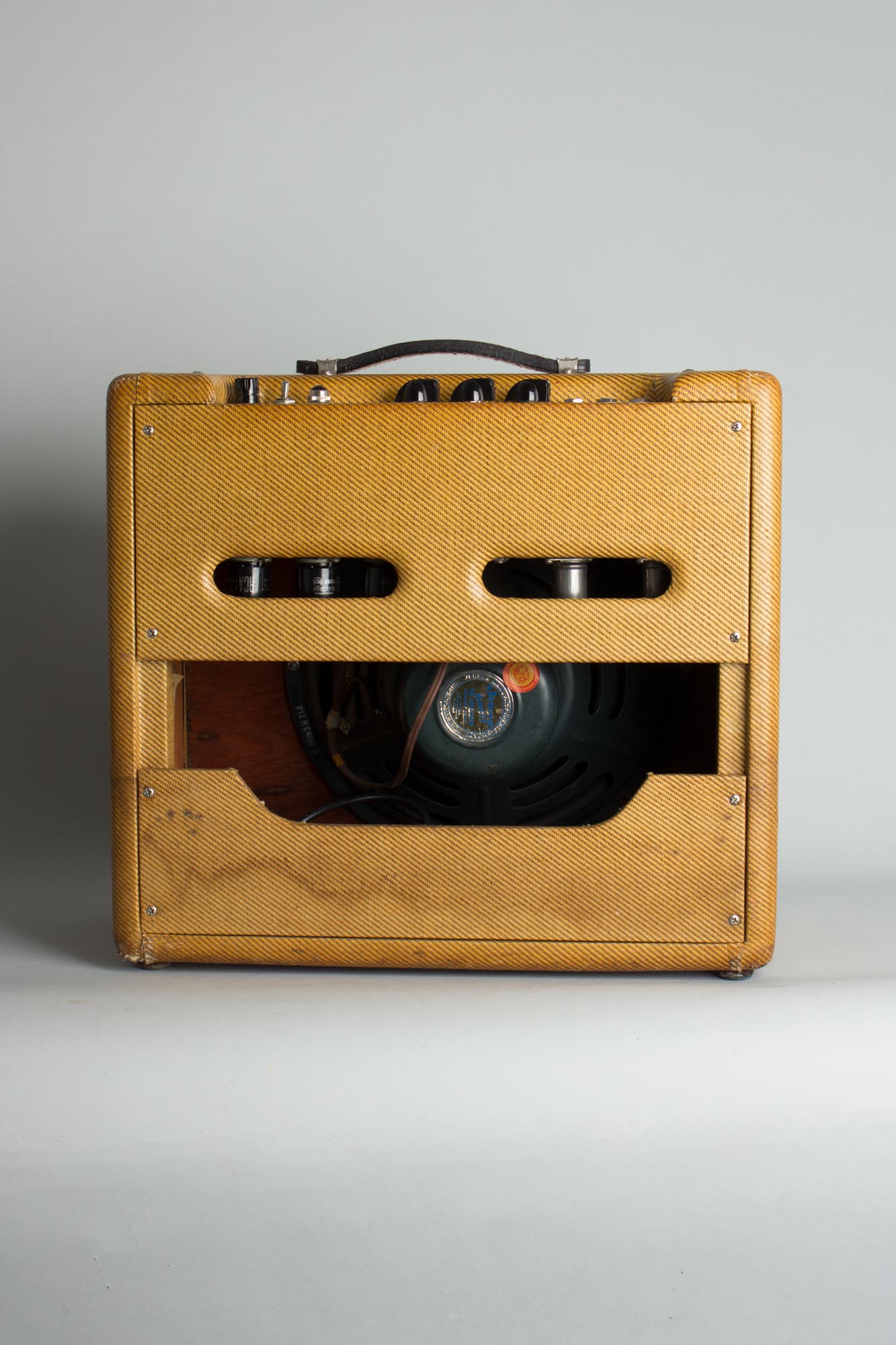 Internally this is a nicely original amp, with no circuit changes, just typical maintenance work. The original single 12" blue Jensen speaker dated to the 43rd week of 1953 remains fully intact. The transformers are untouched original, the Power transformer coded 6452 and the output marked 246. The original pots are dated in a range all from 1953: 304 312, 304 345 and 304 349. The rectifier and power tubes are all period vintage (and quite possibly original) RCA. To keep this amp sounding great in the 21st century there has been the standard cap work with all electrolytic caps replaced and a 3-prong grounded cord added. The original two red "firecracker" Astron caps are still intact and performing well. All tube sockets, pots and jacks have been cleaned.