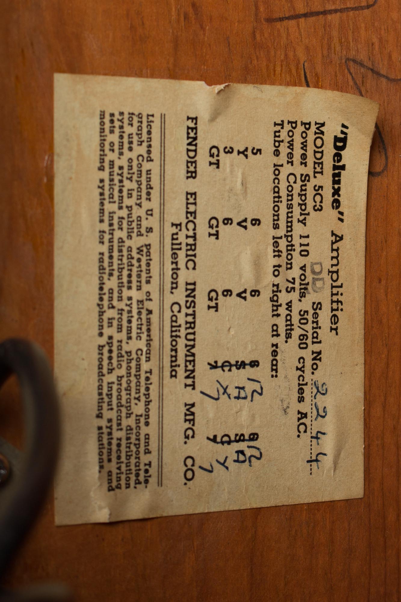 This is a truly superb example of a wide-panel tweed Deluxe, one of Fender's all-time classic amplifier designs. The tube chart and chassis carry the code stamp "DD" indicating a production date of April 1954. The masking-tape with the assembler's signature remains inside the chassis; Lupe wired this one up, we are big fans of her work! The addition of a separate on/off switch not incorporated into a pot was the most notable change this model offered from the preceding 5B3 Deluxe, which was effected during 1953.