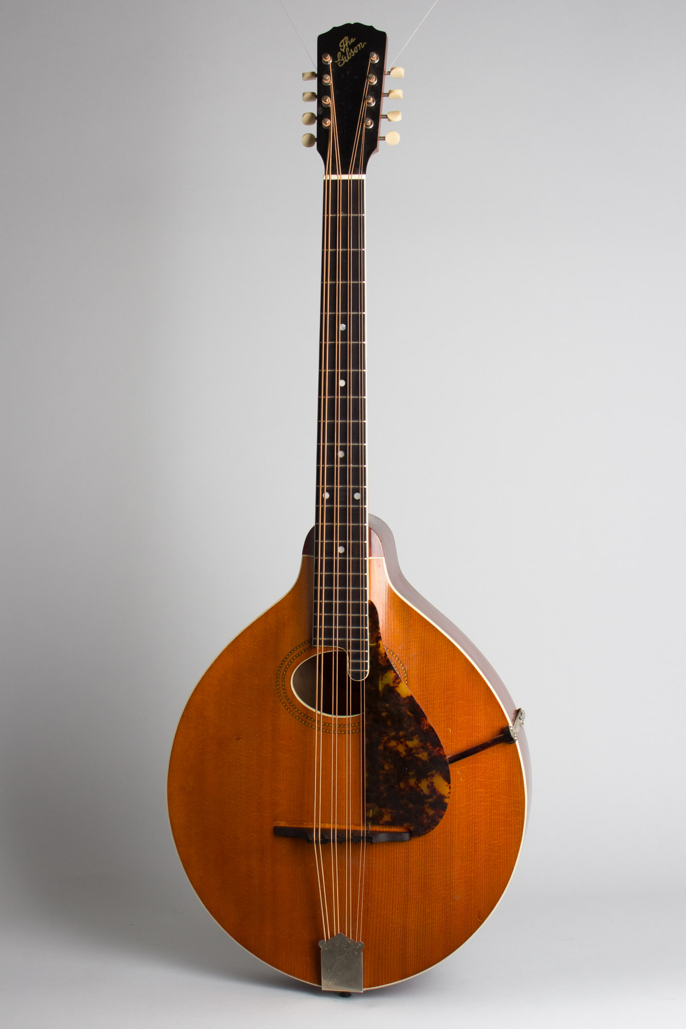 This 1914 "Pumpkin top" K-1 Mandocello dates to the decade when Gibson was defining the market for these mandolin family instruments. In the 1910s-'20s these Gibsons were only available from licensed teacher-agents, and were usually purchased on a time payment plan along with lessons. As part of the deal, the students would often play in the teacher's fretted orchestra, and the low-tuned mandocello was crucial to achieving a full sound in these ensembles. Far fewer were sold compared to mandolins, however, making Gibson mandocellos from any era a comparative rarity.