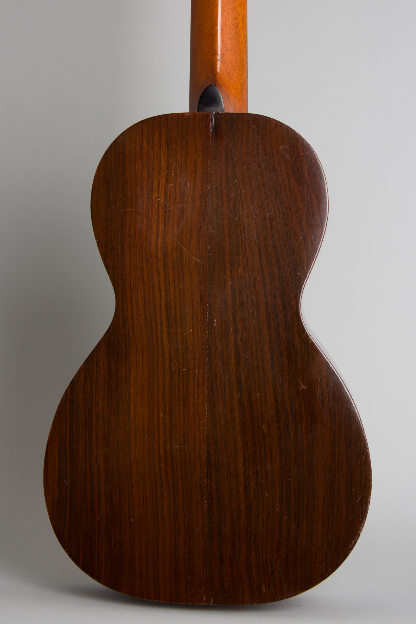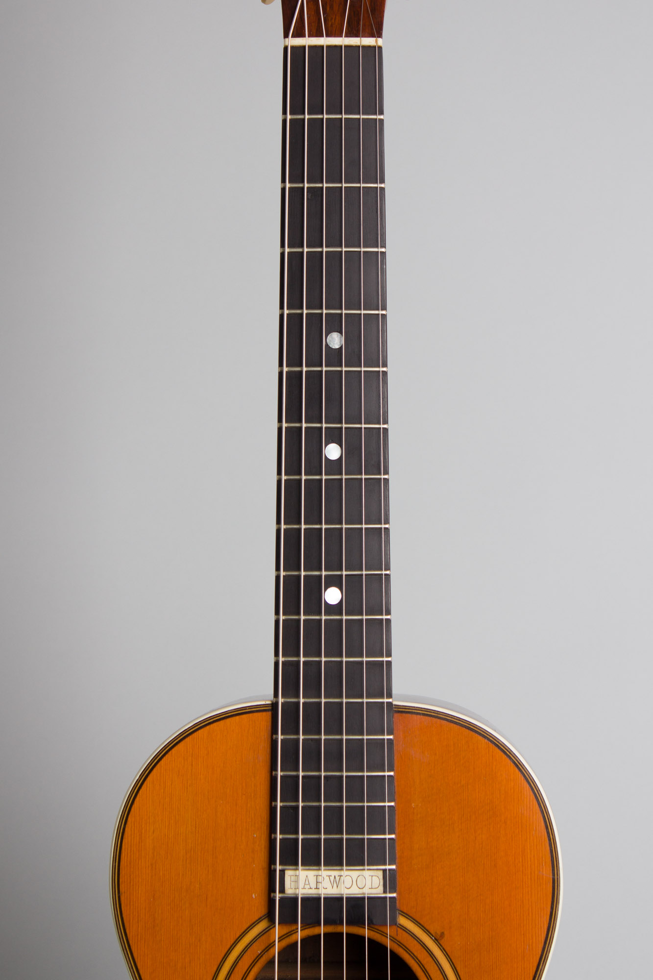 Harwood Parlor Guitar, c. 1915, made in Kansas City, serial # 21051, natural varnish finish, rosewood back and sides, spruce top, black tolex hard shell case.