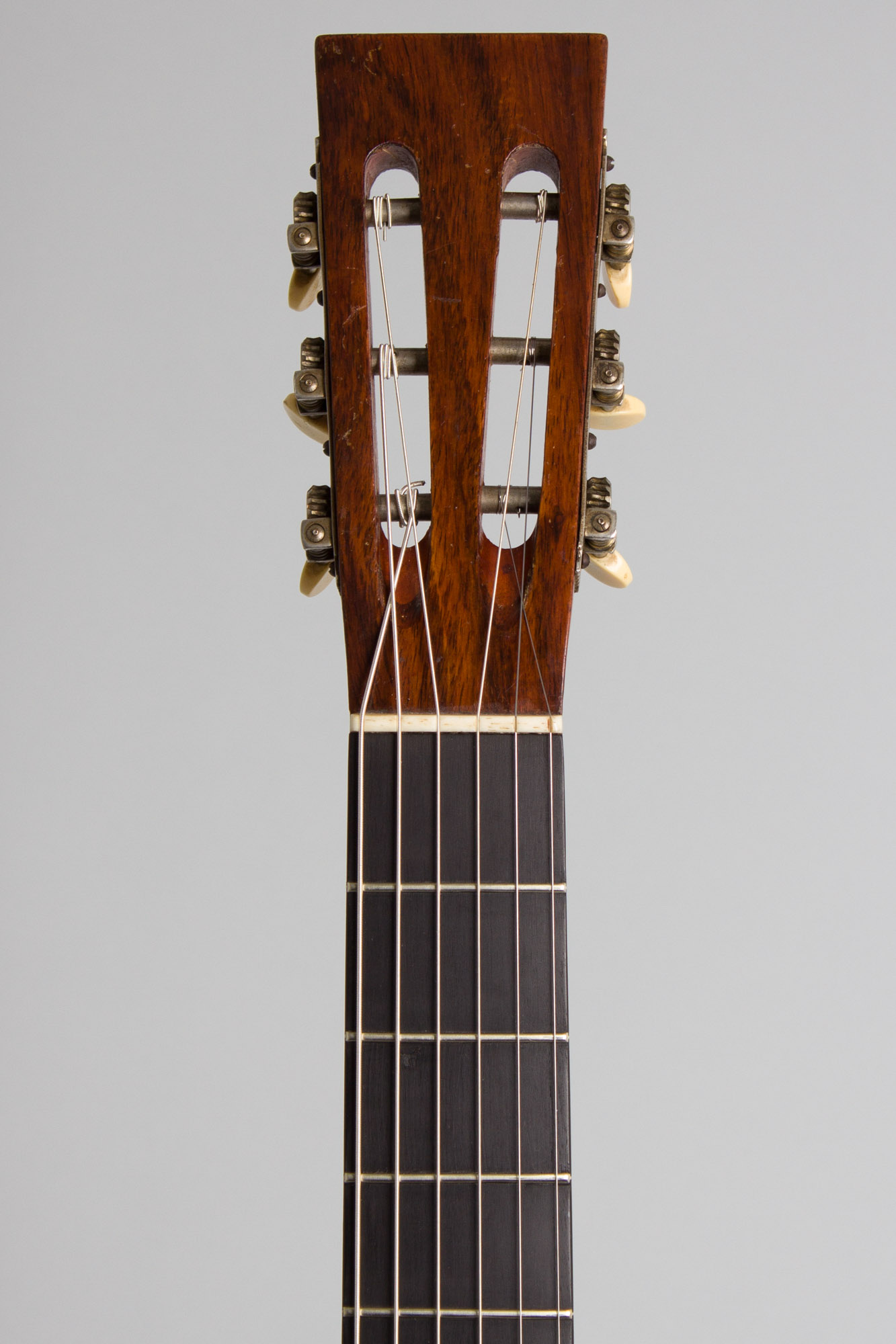 This is an amazingly clean and well-preserved guitar for being over 100 years old, and an excellent playing instrument. The original very thin varnish finish shows some typical micro-checking with a few sworn-through spots and small dings, dents and scrapes but really no heavy wear. Improbably there are none of the common spruce or rosewood body cracks or major repairs either. The parts appear original including the strip tuners and bone bridge pins.