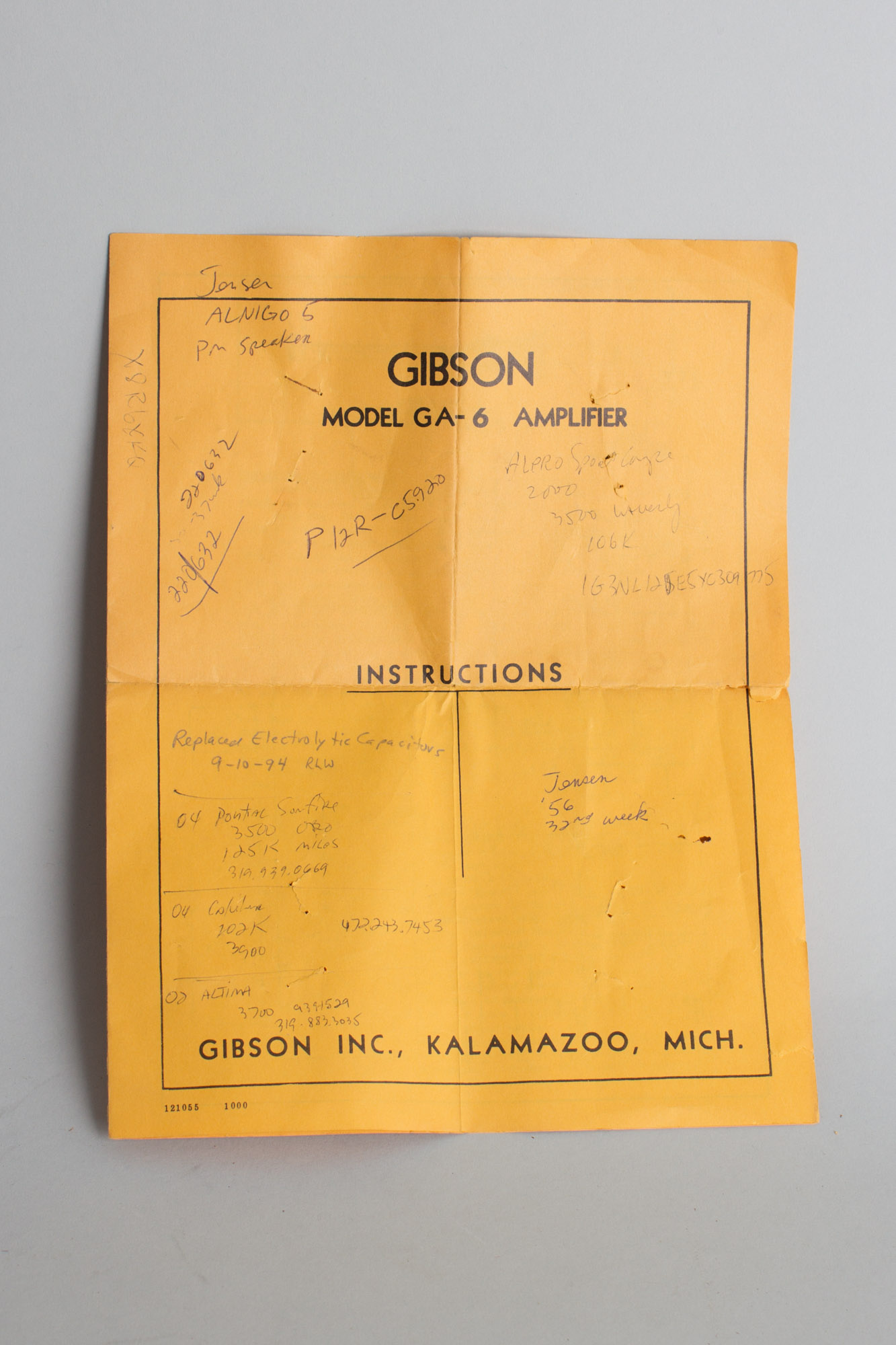 Much like the 5C3 Deluxe, the GA-6 sports two channels, each with a volume control and a master tone, alongside three instrument and one mic inputs. This amp's outer textured cloth "oatmeal" or "poodle" covering is in immaculate shape, as well as the grille cloth. The faceplate is likewise completely unscathed, with all the stenciled graphics intact and no visible scratches or wear. The original handle is still in great shape and the amp comes with the original brown cloth cover as well as the original instruction manual.