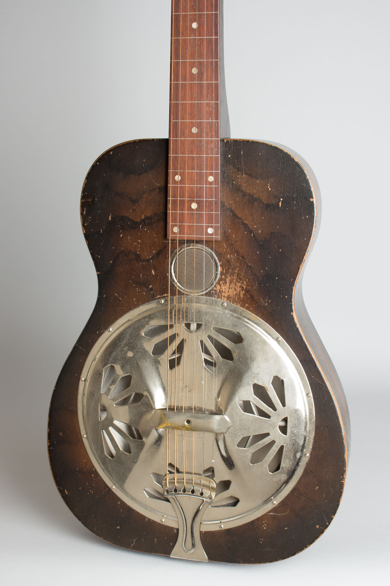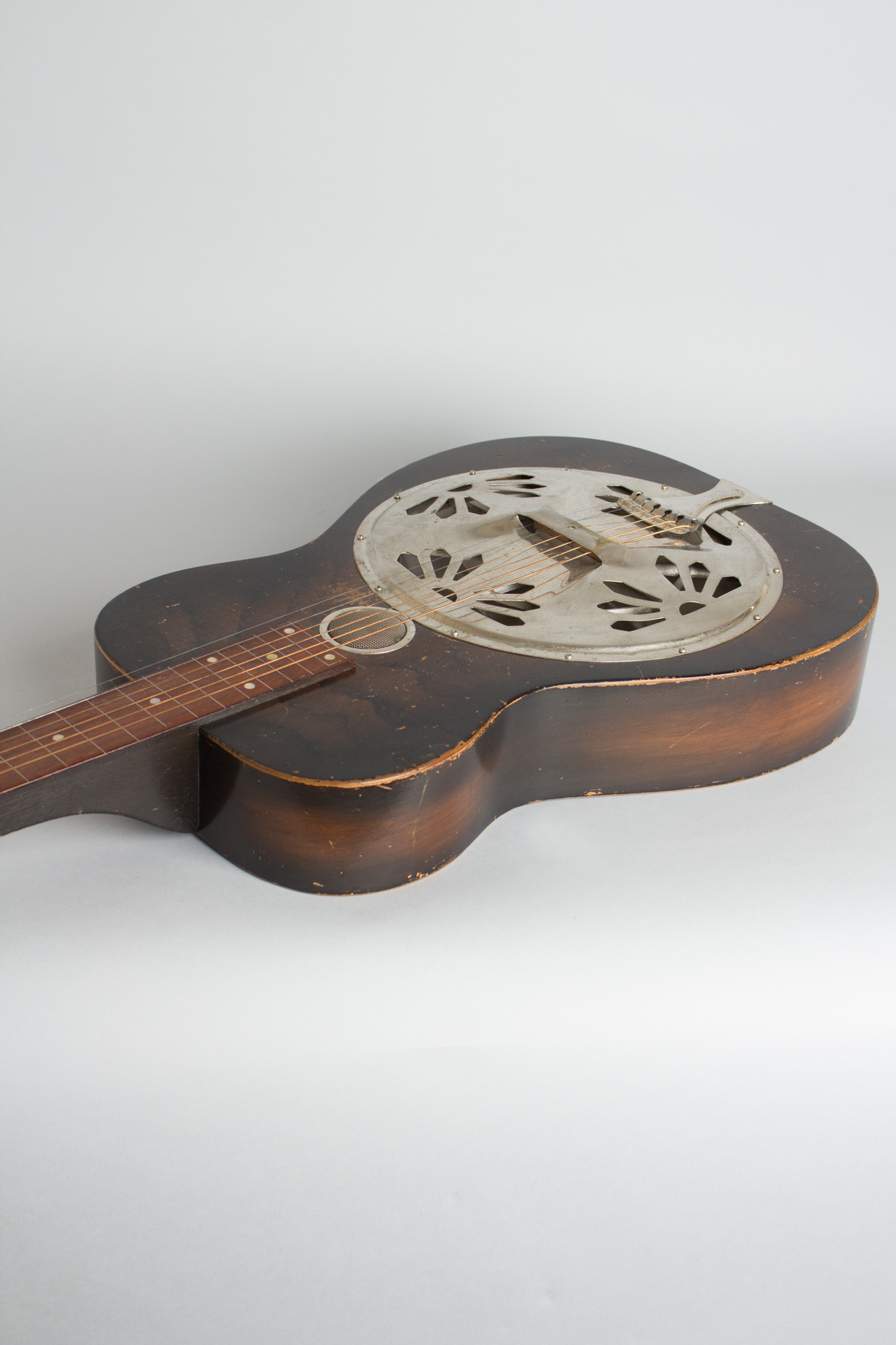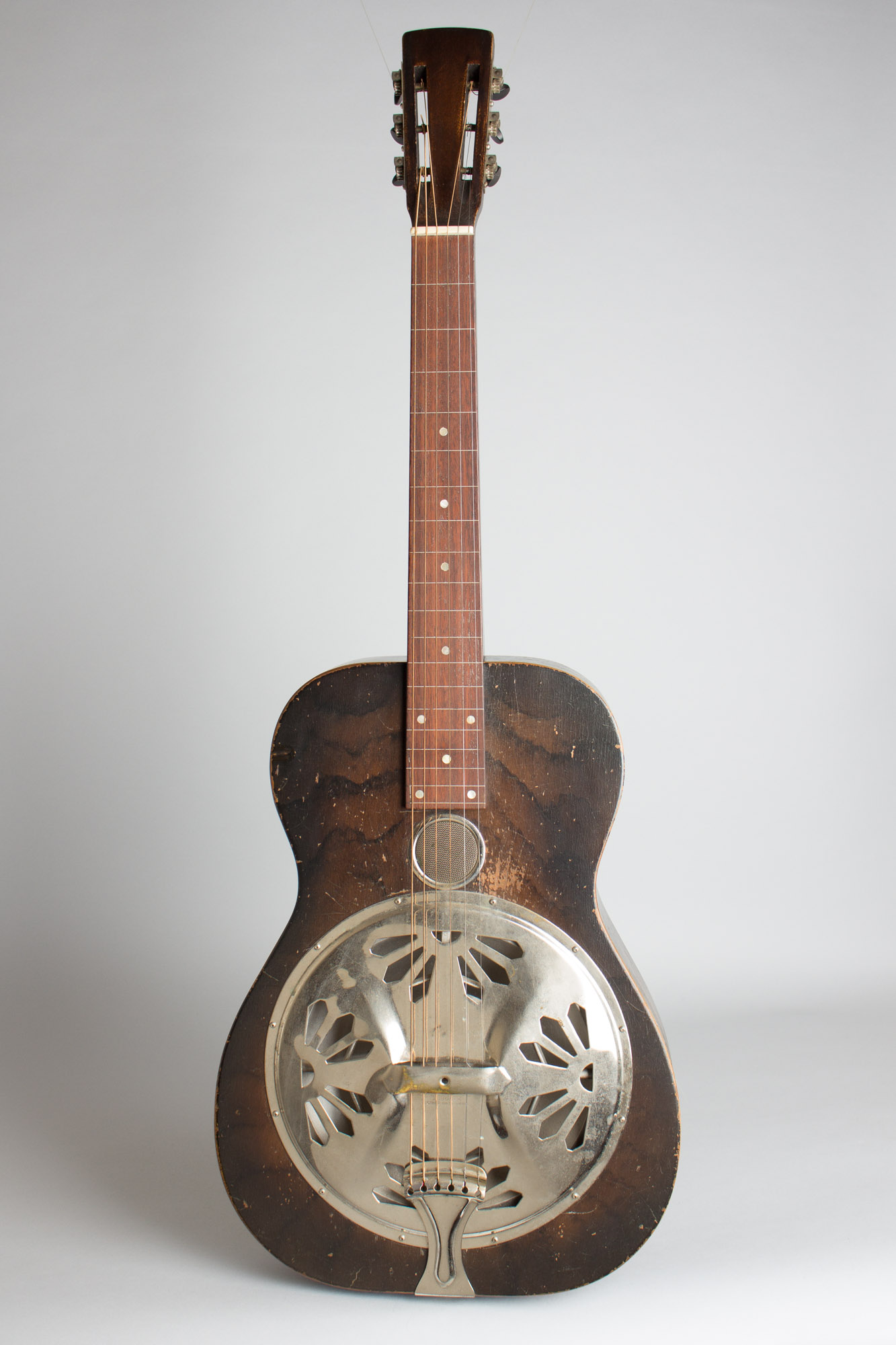 Some overall finish wear but no visible damage or repair; a nicely original guitar. No Dobro decal but no evidence that one was ever present; this may have been an unmarked catalog or jobber instrument. Very fine sound; a sweet classic 1930s Dobro. Overall Very Good + Condition.