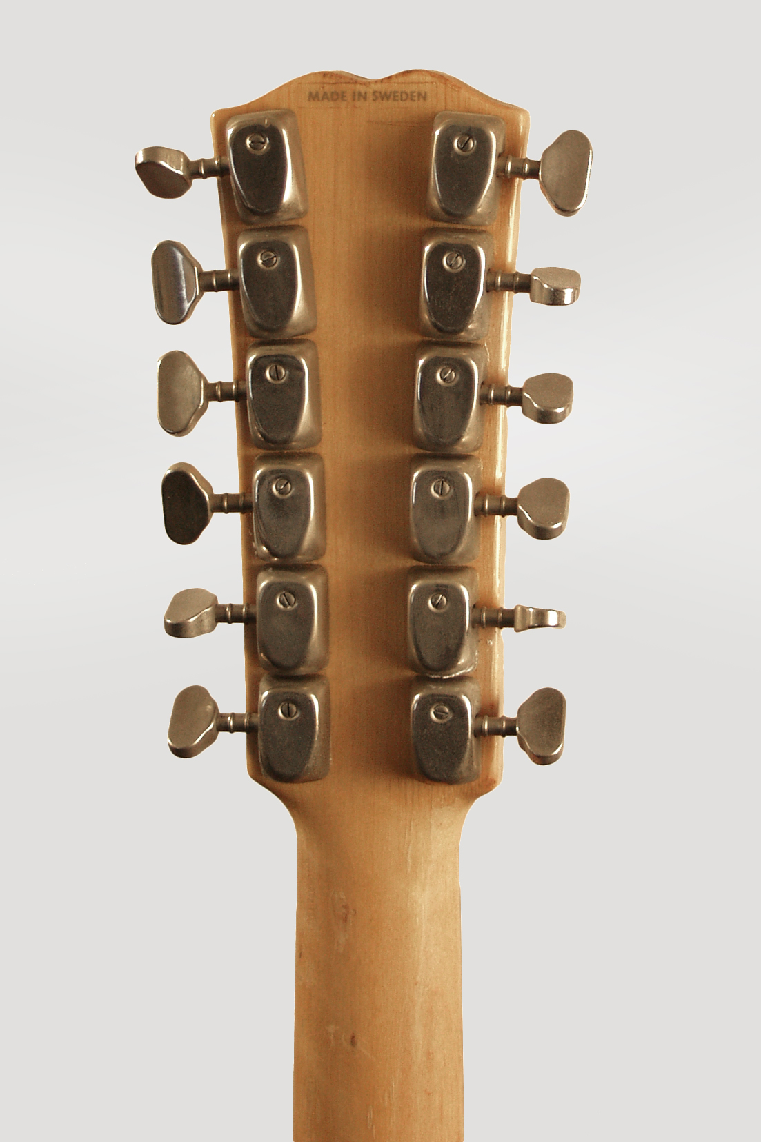The Swedish-made Hagstrom line of guitars was imported to the US in the mid 1960's by Mershon Musical Products of New York; they were well-engineered but fairly inexpensive and appear to have sold very well. The necks are quite slim, re-inforced with a very sophisticated metal-sheathed truss rod system ("The Hagstrom Secret" according to the catalogs) that keeps them true over time and very easy to play. The two single-coil pickups are controlled by a single master volume knob and a bank of switches allowing on/off for each and "Mute" and "Tone" functions. This 12-string is one of the less common models, introduced in 1966 and available for a few years after. It is unusually light and handy for a 12-string, with a very good bright sound and a lot of sonic possibilities. Hagstroms in general were very popular with amateur teen combos in the mid-late 60's and remain an excellent bargain in a good quality vintage guitar. The F-12S in particular scored a very unusual endorsement in the '60's, being featured in company ads with The Mothers Of Invention, personally brandished by Frank Zappa!