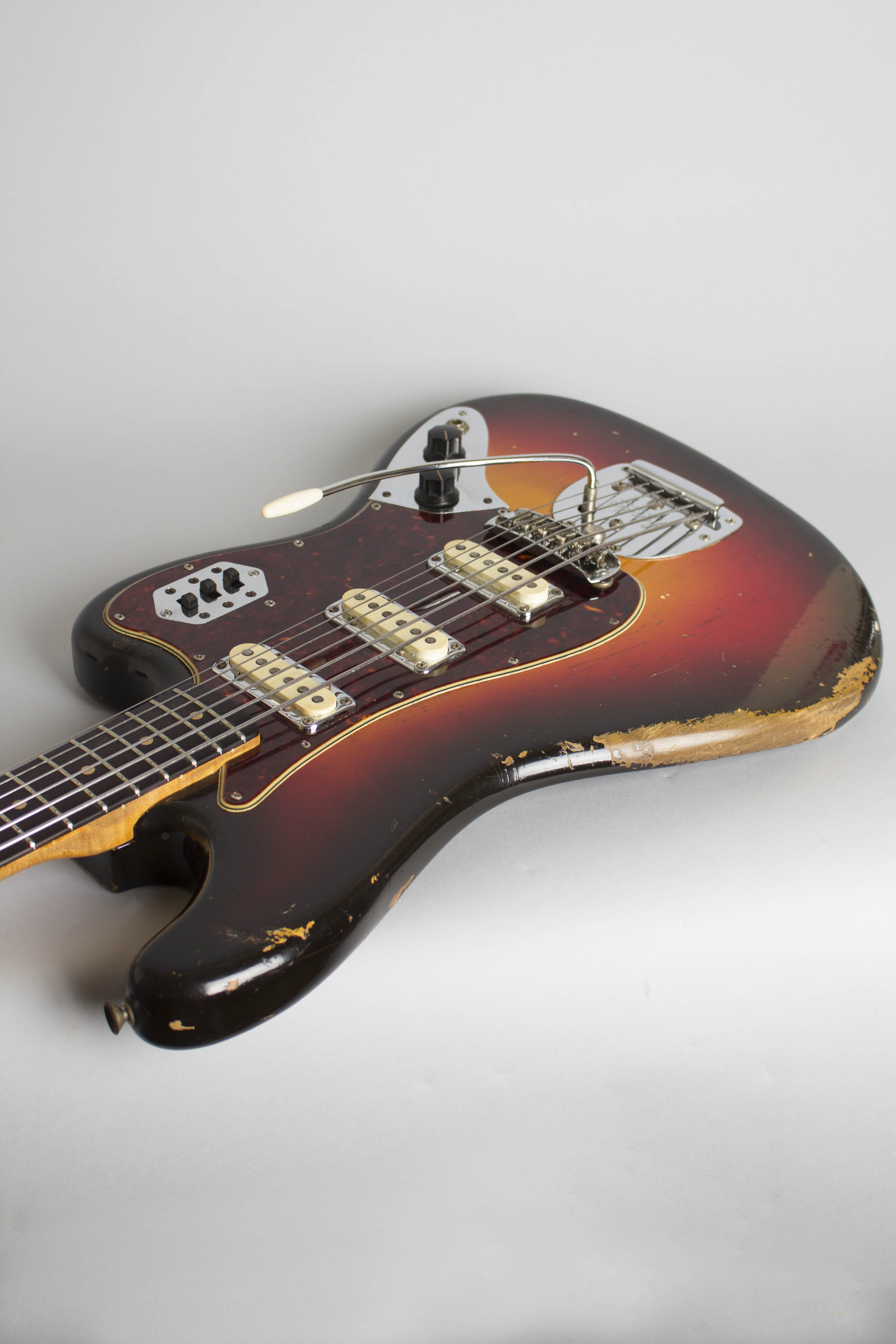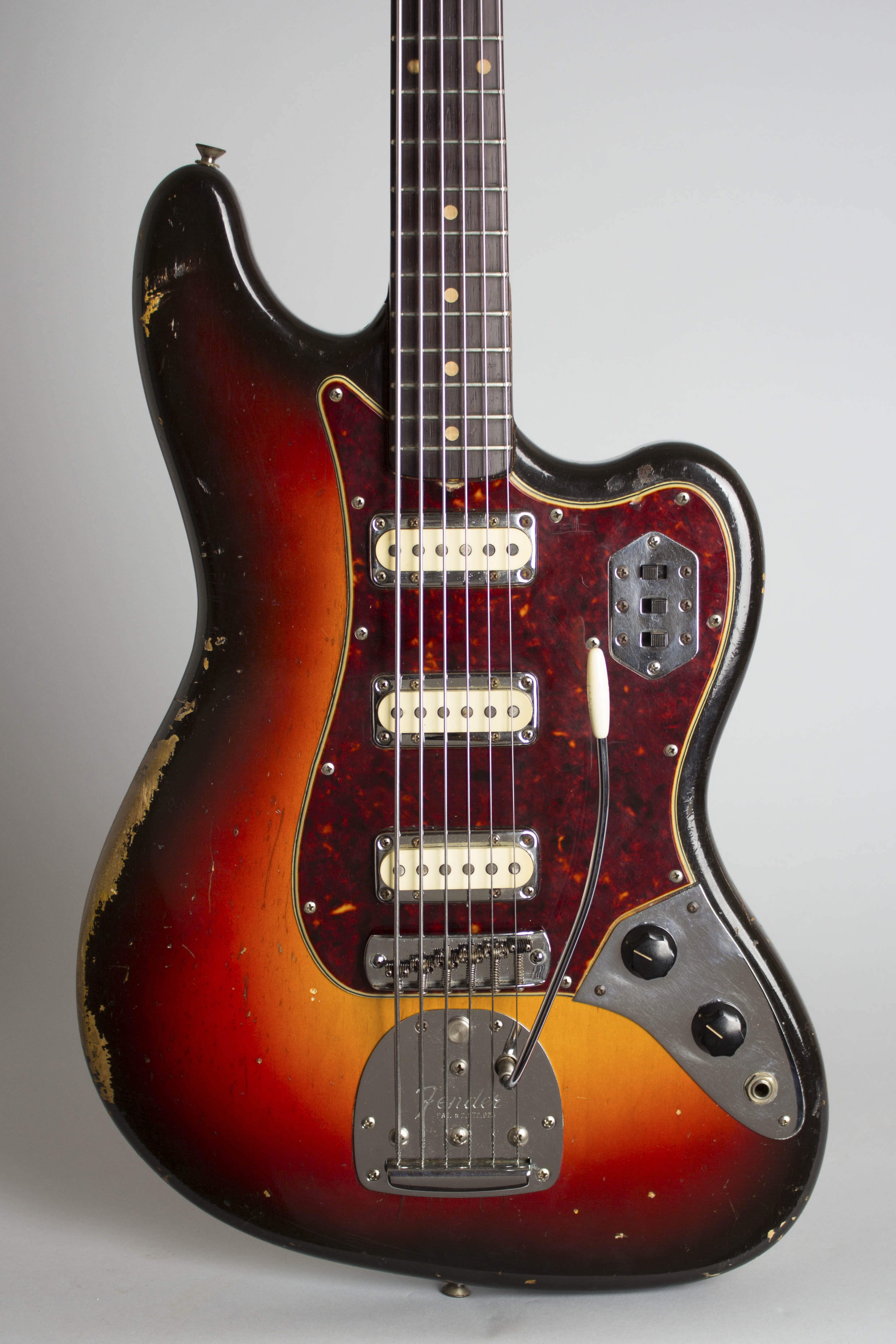 These early VIs are quite rare; later on in 1963, these Stratocaster-styled pickups were replaced with Jaguar units, and a fourth "strangle" switch added to the wiring rig. This is not only a serious rarity but a great sounding and playing 6-string bass with an amazingly wide range of tones from its three pickups, and a vibrato arm to play with, if you dare. This bass is also a dead ringer for the one Jack Bruce played with the Graham Bond Organization and early Cream, except his was even more worn in than this one in 1966! A very cool example of one of our favorite instruments.