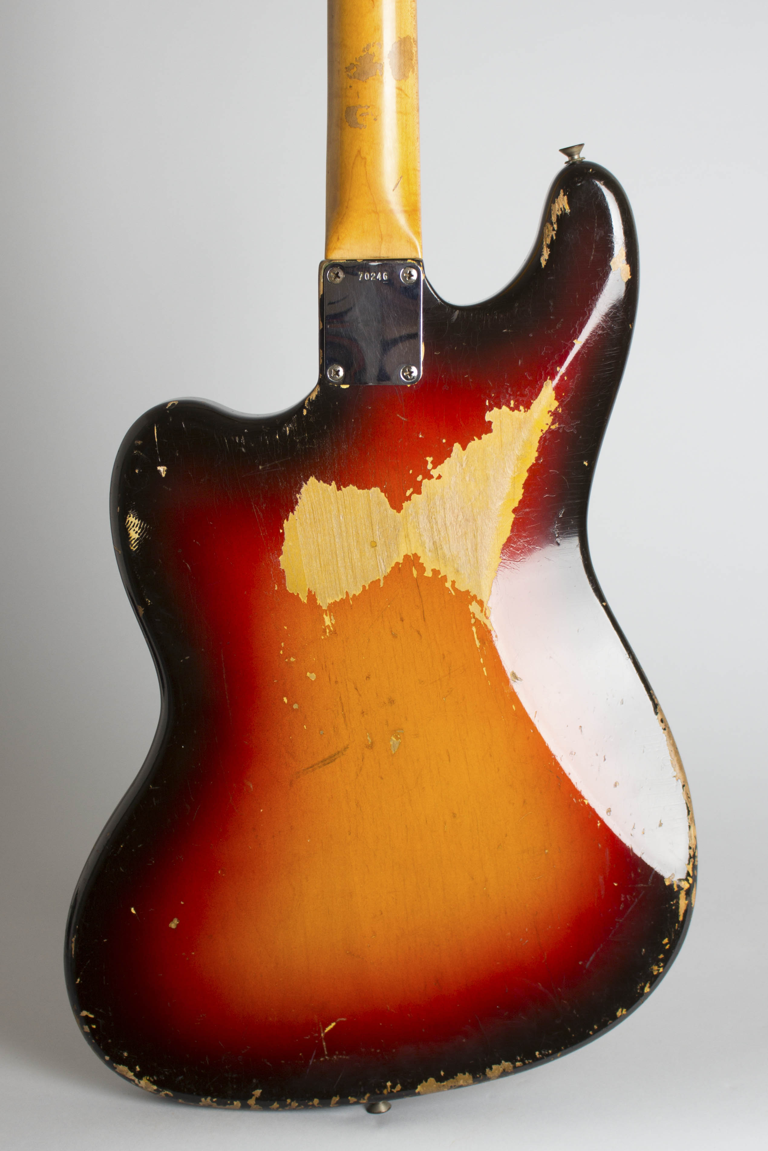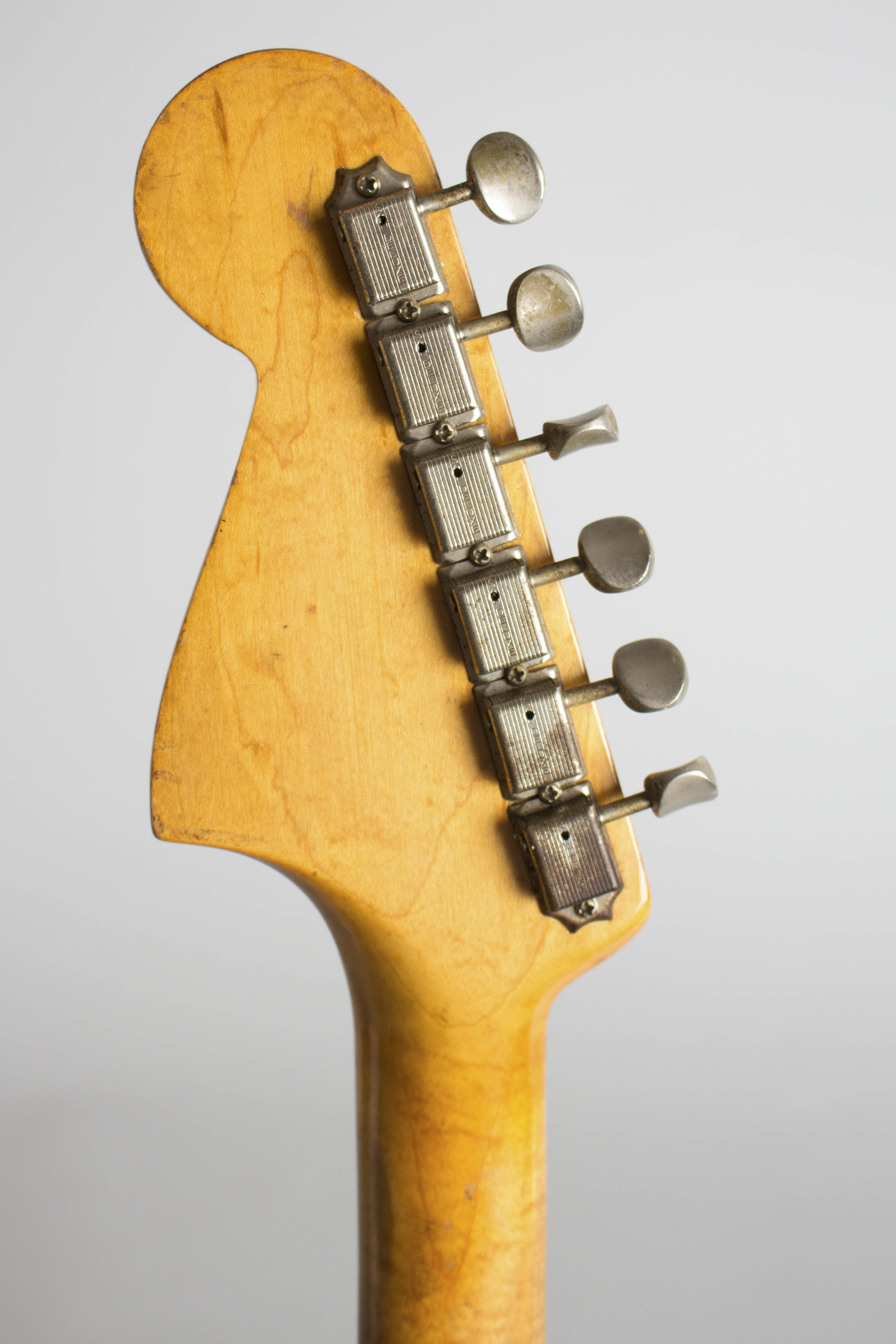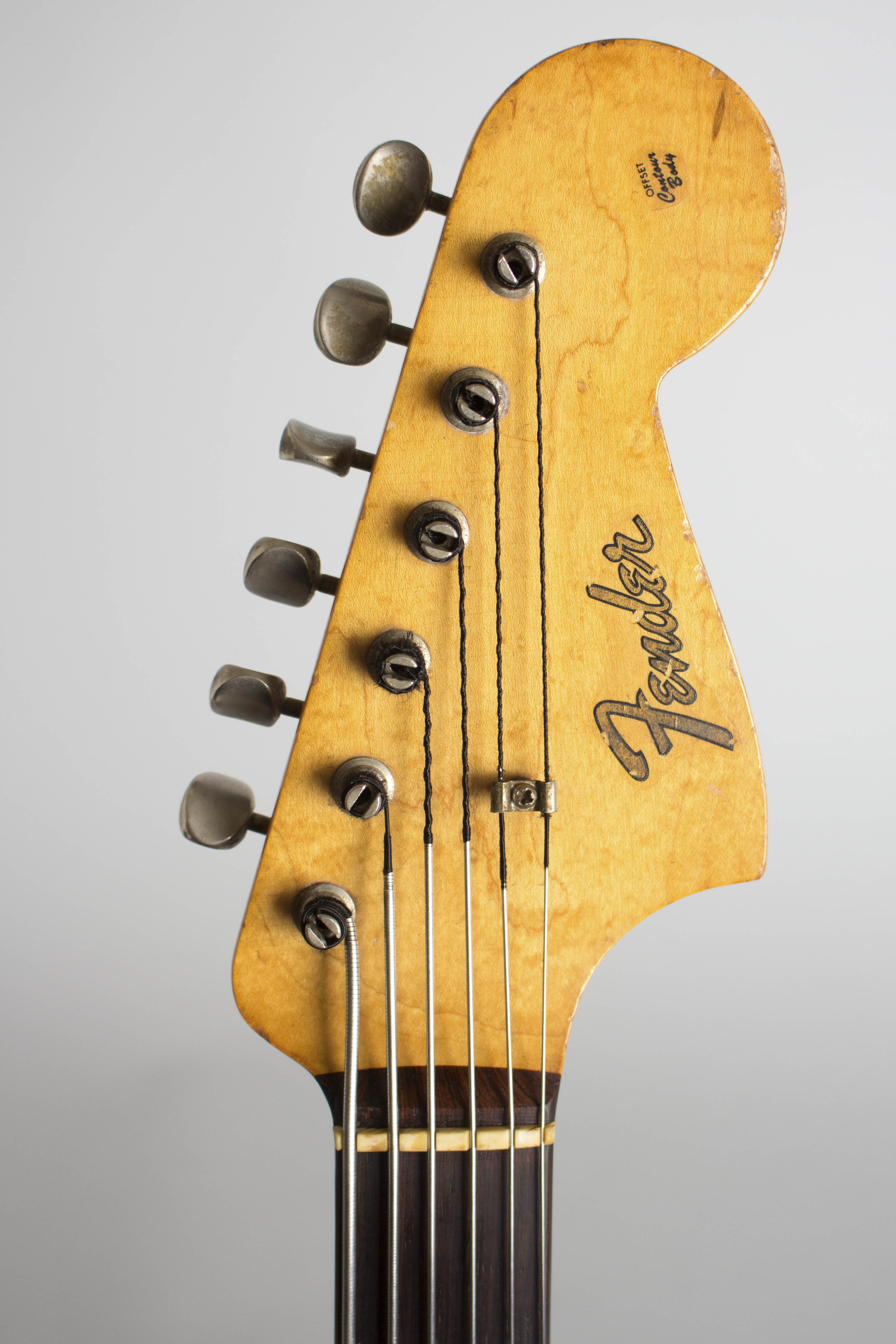 This is the earliest pre-CBS Fender Bass VI we have ever seen, well-played with some moderately heavy wear but no major alterations. The neck date penciled on the heel is 10-61 and the pots are dated even earlier, stamped 304-6120 and 304-6135, all indicating the bass was one of the first of the new model to be assembled from the first production batch. Further evidence of that is the headstock decal; it simply reads "Fender", as the full "Fender VI Electric Bass Guitar" logo was apparently not ready yet when this neck was needed! The Fender VI (that is its original official name, though it is universally called the "Bass VI" today) was the company's big instrument unveiling at the July 1961 NAMM show, but production as usual did not get underway until the fall of that year; we have never seen a production example dated earlier than October.